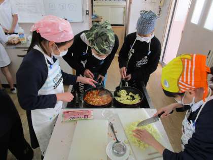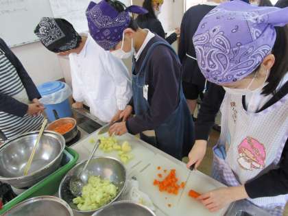 家庭科の「工夫しよう、おいしい食費」の学習で調理実習をしました。卵料理、じゃがいも料理、野菜料理から選んで作っていました。