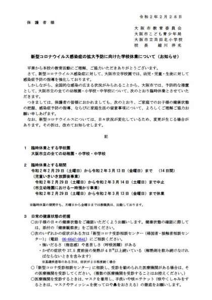 新型コロナウイルス感染症拡大予防に向けた学校休業について