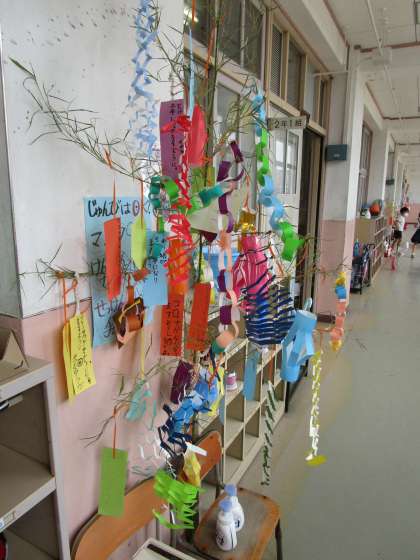 今日は七夕。残念ながら天気は雨模様のようです。子どもたちは、それぞれの思いを込めて短冊に願い事を書き、笹飾りをつけていました。願い事がかなうといいですね。