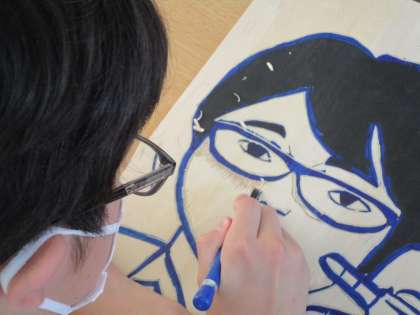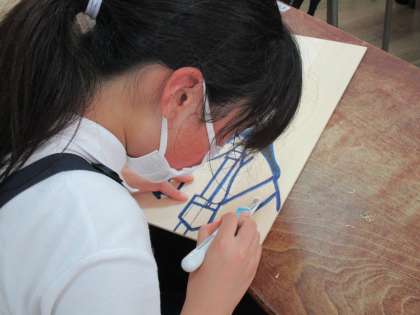 6年生は図画工作で、「自画像」の版画制作に取り組んでいます。顔の輪郭や目・鼻・口をしっかりとした線で形どり、彫刻刀で彫っています。