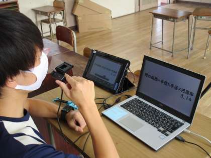 先生はカメラに向かって話しかけ、パソコンで問題画面を提示