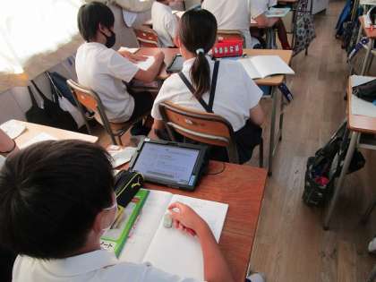 児童はタブレットで画面を見ながら復唱したり、ノートに解答したりしました。
