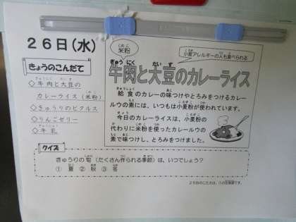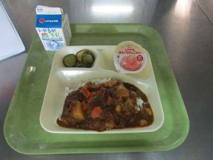 牛肉と大豆のカレーライスで調理員さんの工夫でラッキーニンジン「ハート♡」と「スター☆」が入っています。入っていたら楽しいね。裏ラッキーもあるので見つけたらもっとうれしいですね。