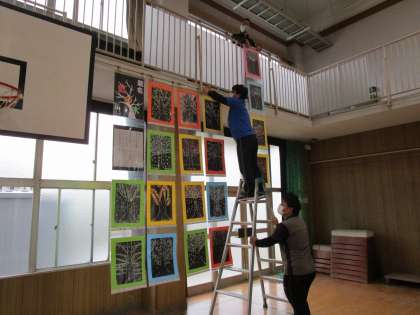 今年から講堂で作品展を行うので、ピーポートに入れた絵画を講堂のギャラリーから吊り下げていきました。位置を調整・確認しながらの作業なので、それぞれに声を掛け合いながら協力して行いました。