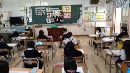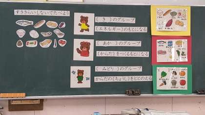 栄養教諭の方に来校してもらい、1年生で栄養について学習しました。