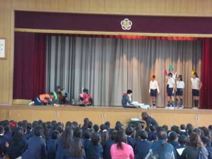 そこで委員会の子どもたちと話し合い、かぜの保健劇「かぜひき太郎と元気太郎」をしました。