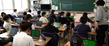 2年生〜6年生の各教室に、一人に一台の学習者用端末(タブレットPC)の設置が完了しました。タブレットPCが42台収まる専用保管庫や無線アクセスポイントも各教室に設置されています。子どもたちは、自分専用のタブレットPCにログオンして使い方の確認をしていました。
