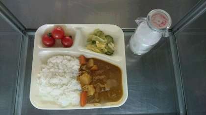 今日の献立は「ポークカレーライス、グリーンサラダ、プチトマト」です。カレーライスは大人気でどのクラスも残食ゼロでした。