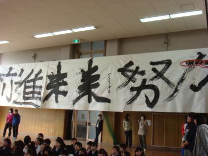そのあと各クラスそれぞれ考えた文字を一画一画書いていきました。1組は「努力」2組は「前進」です。作品は卒業式まで講堂に掲示しています。