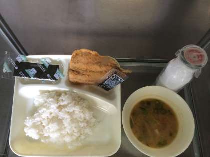 「いわしのフライ、みそ汁、焼きのり」です。小骨があり少し大きないわしでしたが、よーく噛んで残さず食べていました。「いわしのフライおいしい」とたくさんの児童が声をかけてくれました。