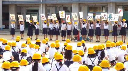 最後に、児童会のめあてが発表されました。各クラスに募集し、代表委員会で話し合われたものです。今年のめあては「笑え!楽しめ!成長だ!」です。