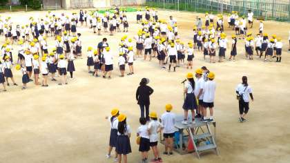 児童集会はスマイル班(縦割り班)で集まって行っています。今日は「自己紹介ルーレット」をしました。班で輪になり、輪の真ん中に目をつむって一人立ちます。音楽が鳴ると周りの人はグルグルと回り始めます。音楽が止まった時に、真ん中の人の正面にいる人が自己紹介をしました。少しずつ、スマイル班の友だちと仲良くなっていっています。