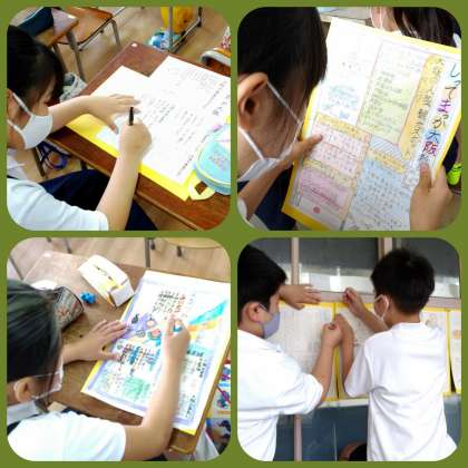 国語科の「みんなで新聞を作ろう」を学習して、一人一人が新聞を作りました。調べたいことを本やインターネットを使ってまとめました。完成した新聞を壁に貼っていきました。