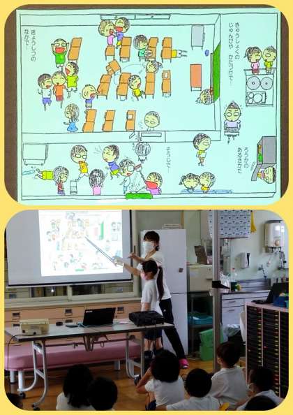 2学期になったので、学年で順に発育測定を行っています。保健室に入ると、測定の前に保健指導を行います。3・4年生への指導は「危険予知力」についてです。ケガをしないで楽しく過ごすためには、『危なくないかな?』『このままで大丈夫かな?』等、危険なことはないか確認することが大切です。子どもたちはイラストを見ながら、どこが危険なのか話し合いをしました。