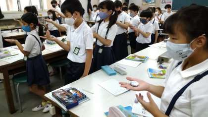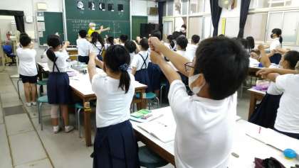 4年生の理科は「月や星の動き」の学習です。月を観察するときの、月の位置の調べ方を学習しました。月が見える位置は、方位磁針を手のひらに置いて磁針のさす方位で調べます。高さは、腕を伸ばしたときのにぎりこぶし1つ分を約10度として、こぶしを重ねて調べます。