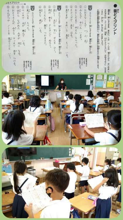 まずは音読から始めます。ユニットで学習する漢字を使った文章を音読します。先生の範読に合わせてリズムよく読んでいきます。