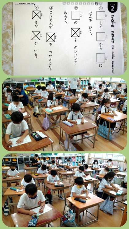 最後は漢字の書き取りです。今日学習した漢字がどれくらい書けるか確かめます。1年生は漢字を習い始めたばかりなので、書ける漢字は少ししかありません。習っていない漢字は書かなくてもよいことになっています。