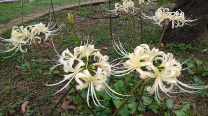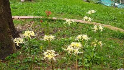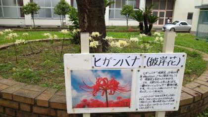 中庭に彼岸花が咲いています。彼岸花は夏の終わりから秋にかけて咲きます。突然に花径を伸ばして鮮やかな紅色の花を開花させるので、昔の人は驚いたと言われています。本校の彼岸花の色は紅色だけでなく、白色の花も咲いています。