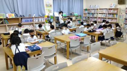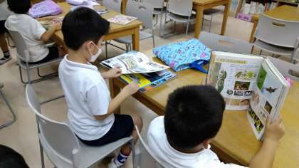 毎週木曜日に1年生の図書の時間があります。好きな本を読んだり、借りていた本の返却や新しい本の借り出しをしたりしています。借りられる本は1人2冊までです。