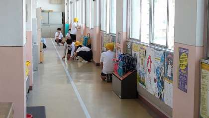 今日の集会は「ひょっこりはん」でした。校舎2階以上の廊下の窓のどこかにひょっこりはんが姿を現します。それを運動場に集まった児童が見つけるゲームです。簡単そうに思われますが、範囲が広いのと、何人現れるのか分からないのとで結構難しいようでした。隠れているのは5・6年生の集会委員です。