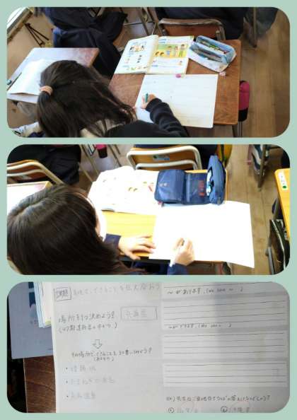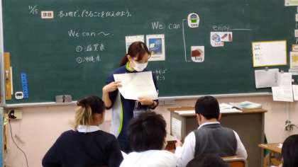 “各地で できることを伝えよう” の学習をしました。都道府県を選び、その場所で見たり食べたりできることを伝え、どこの都道府県か答えてもらいます。“We can eat 〜”(○○を食べることができる) “We can see 〜”(○○を見ることができる)などの言い方を覚えました。