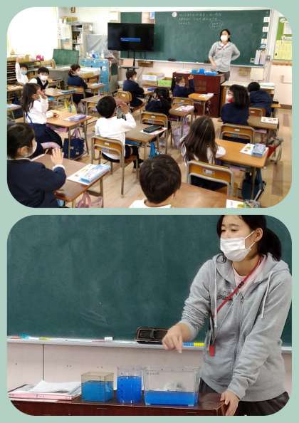 おなじかさの色水をいろいろな入れ物に移し替えた時、色水のかさは同じかどうかを確かめていきます。細長い入れ物に入れると、高さが高くなり多く見えます。大きな入れ物に入れると高さが低くなり少なく見えます。友だちと話し合った結果、「入れ物の太さや細さが変わると水の見え方が変わるだけで、元々のかさは同じだから同じ。」ということにまとまりました。