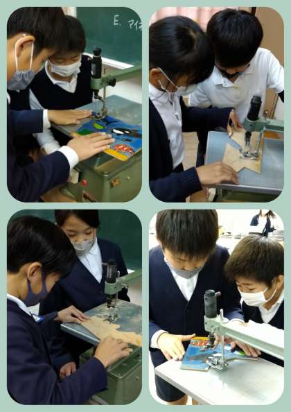 「糸のこを使って」という題材で、パズルを作っています。ベニヤ板に絵をかき、色をつけます。パズルになるように電動の糸のこで切っていきます。楽しい作品ができそうです。