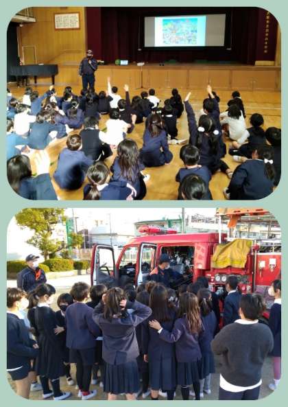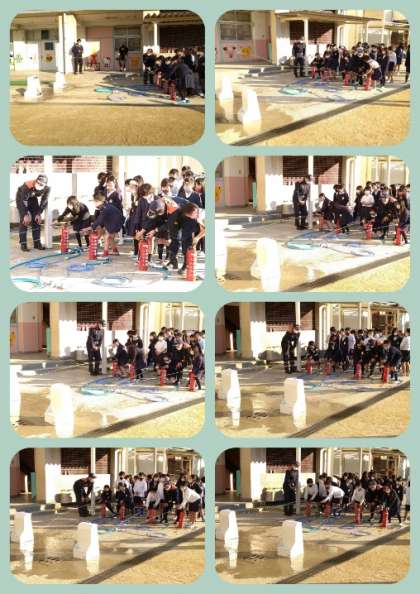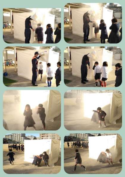 住吉消防署の方に来ていただいて、防災教室を行いました。初めに講堂で、消防署の仕事についてスライドを見ながらお話を聞きました。その後運動場で、煙テントの体験と消火器の体験をしました。煙テントでは、全然前が見えなくて少し怖い感じもしていましたが、背を低くして通り抜けることができていました。消火器は水消火器を使いましたが、消火器の使い方を知ることができました。今日の防災教室では、教科書で習ったことを実際に体験出来てとても良かったと思います。