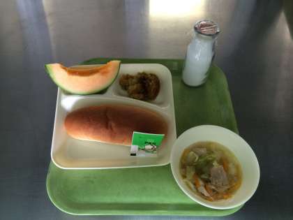 「カレードリア、キャベツのスープ、クインシーメロン、コッペパン、マーガリン、牛乳」です。クインシーメロンはカロテンをたくさんふくんでいる赤肉系のメロンです。赤肉ということで女王を表す「クイーン」とカロテンが多いことから健康を表す「ヘルシー」とを組み合わせて「クインシーメロン」という名前がついたそうです。