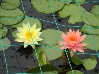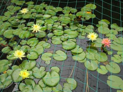 中庭の池には、今年もスイレンの花が咲いています。白色や黄色、赤色などのきれいな花です。