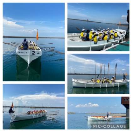 午後からはカッターボートに挑戦しました。櫂の扱い方、ボートの乗り方などの説明を聞いたあと、いざ実践!