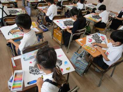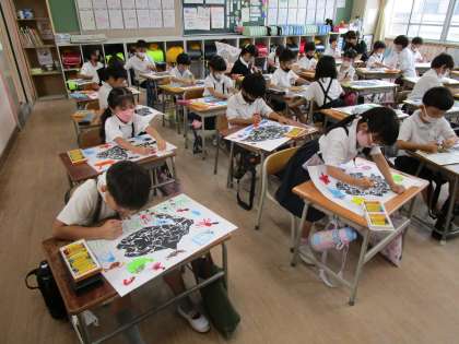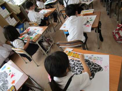「おしゃれな さかな」という作品を仕上げています。はじめに和紙の真ん中に大きな魚を紙版画で表しました。今日はそのまわりにパスで仲間たちを表していきました。仲間は魚だけではなく、エビやカニ、カメやワカメなども描き入れました。いろいろな色を使ってカラフルにおしゃれをしたように表していました。