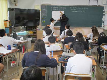 算数科では「拡大図と縮図」の学習をしています。形が同じで大きさのちがう図形について調べます。ポイントは、「対応する角の大きさがすべて等しい」「対応する辺の長さがすべて等しい」という2つの性質です。気をつけながら拡大図と縮図を丁寧にかいていました。
