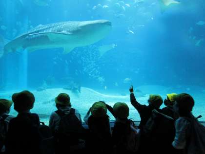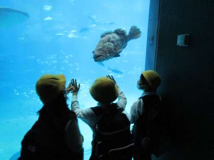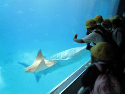 いよいよ大水槽。ジンベエザメやエイなど、たくさんの生き物に見とれていました。