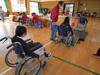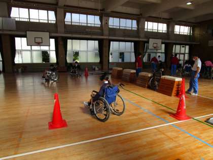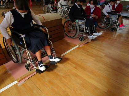 次に自分で操作して、講堂内に設定されたコースを回りました。高さ2センチほどの段差やスロープなどでも、思うように進むことができないことに気づきました。