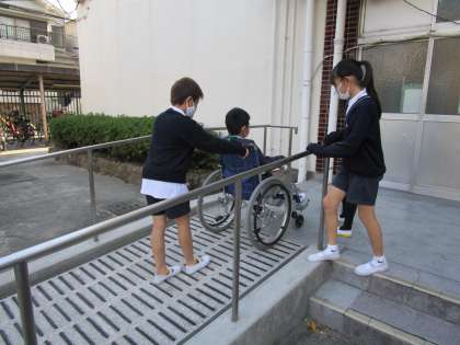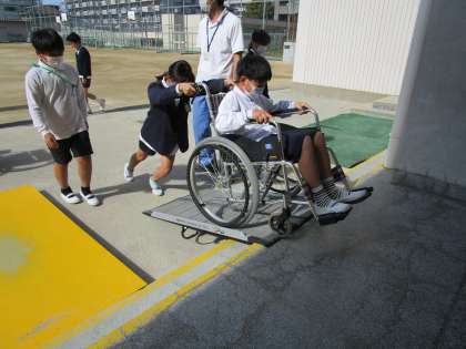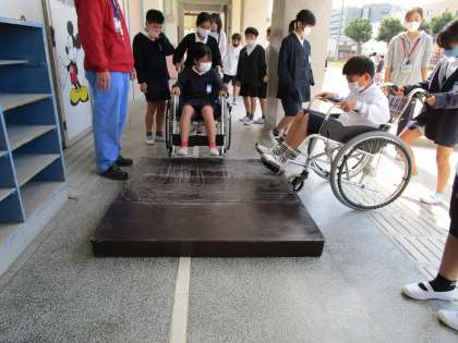 その後、1階の廊下を使って介助体験をしました。車いすに友達を乗せて交代しながら回りました。介助する児童は段差やスロープを越える時の車いす操作などを学習し、介助してもらう児童は段差やスロープの昇り降りがどれだけ怖いかを体験することができました。
