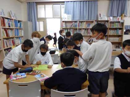 今年は、「クイズスタンプラリー」を行います。児童一人ひとりにスタンプラリーカードを配り、カードの裏に書かれている「読書週間クイズ」に答えてもらいます。たとえば、『ぐりとぐら』からの問題では、「ぐりとぐらはどんなかごをもって、とりにいったでしょうか?」のように、本に書かれてある内容になっています。さっそく休み時間に図書室に来て解いていました。