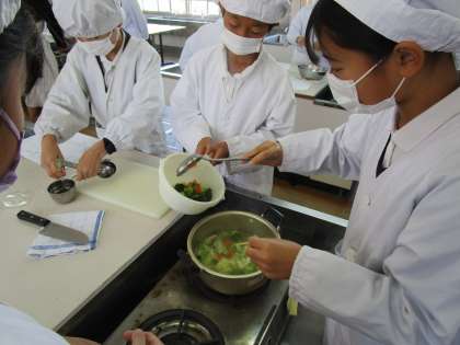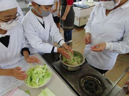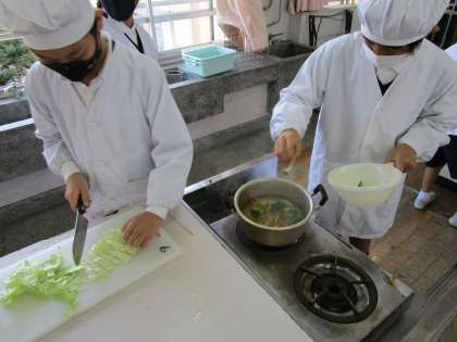 にんじんを厚めに切ったために、火が通るまで苦労している班もありました。手際よくキャベツを切っている子もいました。みんなで仕事を分担したり協力したりして調理していました。手作りドレッシングをかけて、おいしくいただきました。