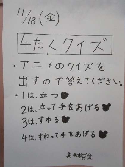 今日の集会は、4択クイズでした。主にアニメからの問題です。「ドラえもんの好きな食べ物は何でしょう?」や「ワンピースフィルムレッドでシャンクスの娘は何という名前でしょうか?」などの問題を集会委員会の児童が考えて出していました。