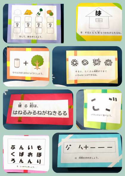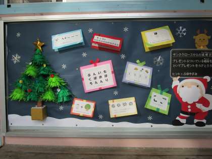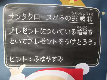 今、保健室前の掲示板には「サンタクロースからの挑戦状」がはり出されています。「プレゼントについている暗号をといて、プレゼントをうけとろう。」というメッセージがそえられています。暗号は全部で8問です。子どもたちはとくことができるのでしょうか?