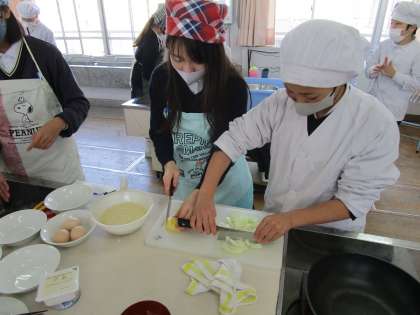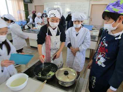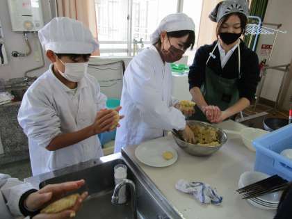 今日は、6年2組が調理実習で「とうふハンバーグ」を作りました。包丁の扱い方が上手な子どももいます。生のハンバーグ(?)をこねるのが苦手な子どももいます。