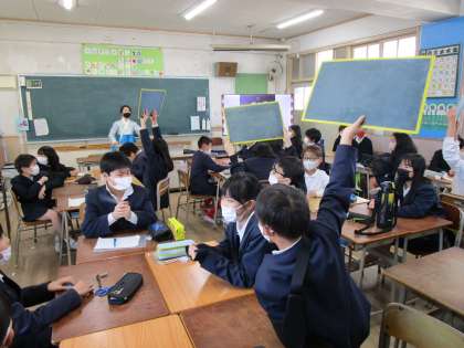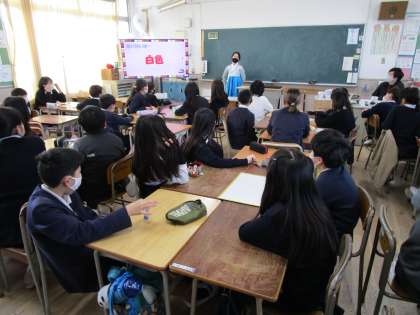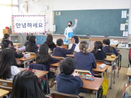 我孫子中学校から、ユン・マミ ソンセンニム(韓国・朝鮮の先生)に来ていただいて、韓国・朝鮮についての学習をしました。主に韓国・朝鮮の衣・食・住についてクイズ形式で学習しました。「韓国・朝鮮の有名な食べ物 キムチは何種類あるでしょうか?」とか「韓国・朝鮮の家で 寒さをしのぐためにつけられている設備は何でしょうか?」などの問題にグループで相談して答えながら、楽しく学習しました。