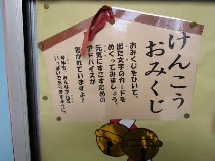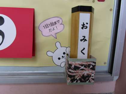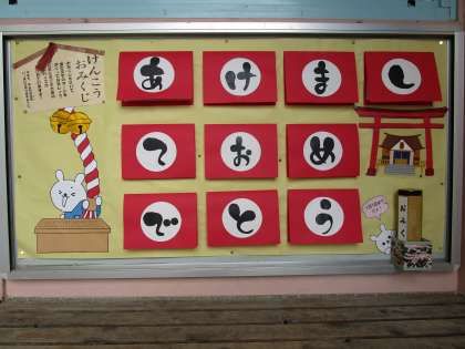 保健室前の掲示板には、「けんこう おみくじ」があります。おみくじを引くと、大吉や吉、小吉、中吉、凶、中には大大吉もあります。その中には「出会った人に大きい声であいさつをすると、よく眠れそう。」とか「時計を見て3分間、歯みがきをしよう。キラリと輝く白い歯でモテモテだ!」などと、元気に過ごすためのアドバイスが書かれています。今年もみんな健康で、いい一年になりますように。