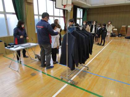 4月から中学生になる児童の制服の採寸を業者がしました。対象は、東我孫子中学校・我孫子中学校に進学する児童です。初めて中学校の制服に腕を通す児童の笑顔が素敵でした。