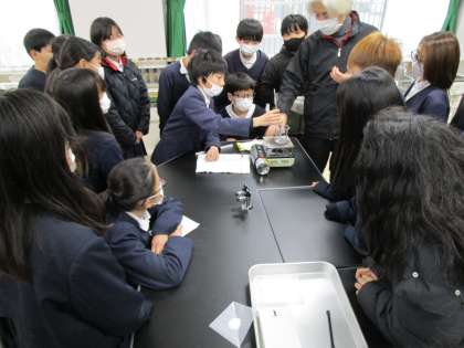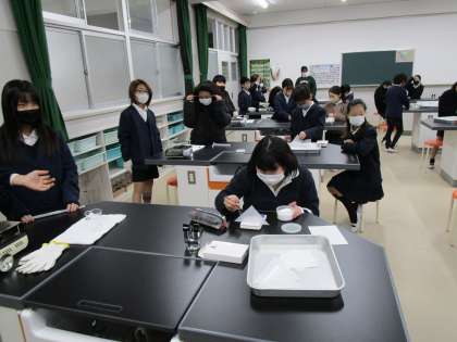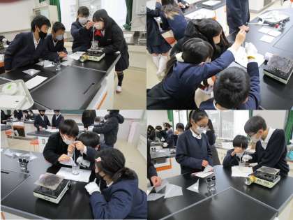 電子天秤でミョウバンの量を量ったり、温度計で水の温度を計ったり、ガラス棒でかき混ぜたりとグループで役割を分担して実験をしました。ミョウバンは水の温度を上げるとたくさん溶けるので、驚いていました。
