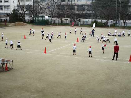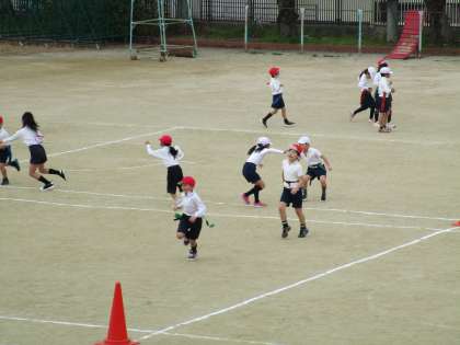 体育でしっぽ取りをしました。攻撃チームは腰につけてあるタグを取られないように相手をかわして進みます。守備チームは相手が通り過ぎるときにタグを素早く取ります。攻撃・守備チームとも、動きを工夫して楽しく運動していました。
