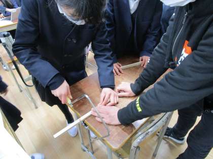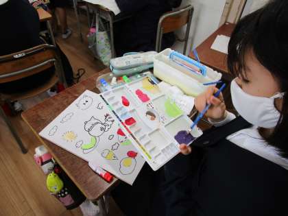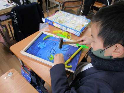 「コリントゲーム」を制作しています。書いた下絵に色を塗り、角棒を木工ボンドではります。部品を取り付けてくぎ打ちをします。初めてのこぎりや金づちを持つ子はなかなか上手く使えず時間がかかってしまいます。逆になれた手つきで最後のくぎ打ちをしている児童もいます。先生や友だちに教えてもらいながら進めています。