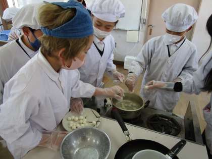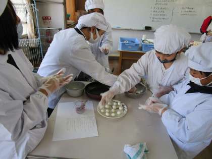 今日は1組が調理実習で「みたらし団子」を作りました。2組と同じように、白玉粉に豆腐を混ぜた団子です。水は使わず、とうふの水分で混ぜることができます。みんなで団子を丸めて茹でました。茹でた団子をつまようじに刺し、フライパンで焼き目をつけ、作ったたれで食べました。とろ〜りとしたお団子をおいしくいただきました。