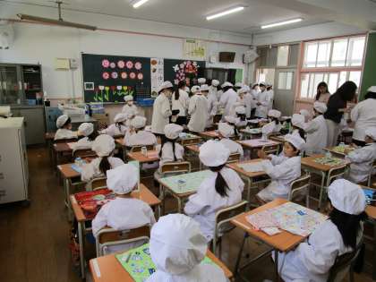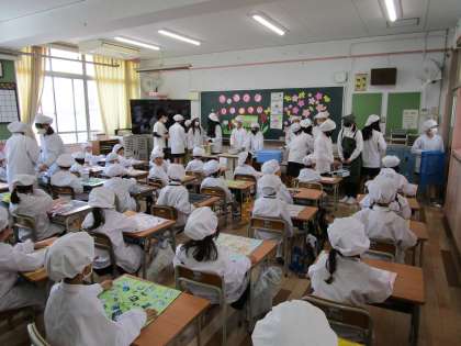 給食が始まりました。1年生にとって小学校生活初めての給食です。