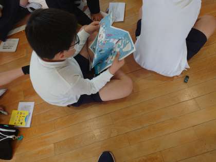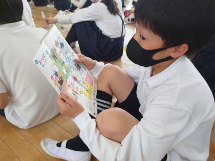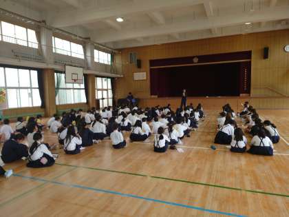 4、5年生が遠足の説明を講堂で聞いていました。4、5年生は万博公園に行くようです。